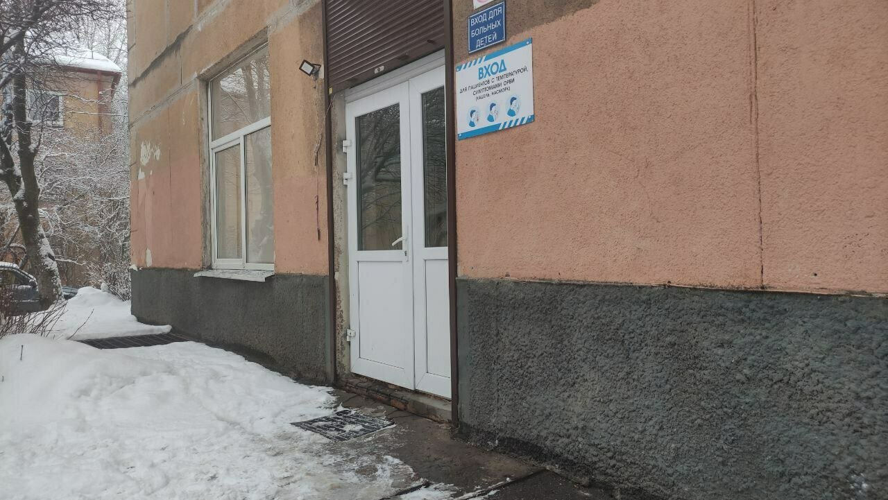 На Дзержинского, 104а, не ступала нога дворника. Площадка завалена снегом, под ним несколько слоёв наледи. Каждый день сюда добираются десятки маленьких пациентов с родителями. Как и везде — отдельный вход для больных с температурой. Там даже не почищено крыльцо.