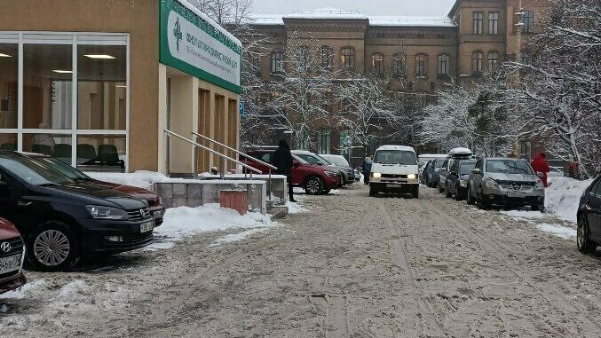 Учреждение посещают в том числе беременные. Лестница почищена и посыпана песком, пандусы — нет. Тротуары ещё не убраны, но дворник с большой оранжевой лопатой обещает справиться в течение получаса. Мужчина утирает пот со лба и говорит, что такой зимы ещё не видел.