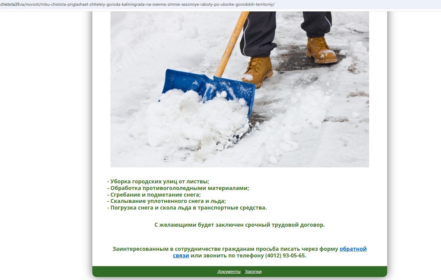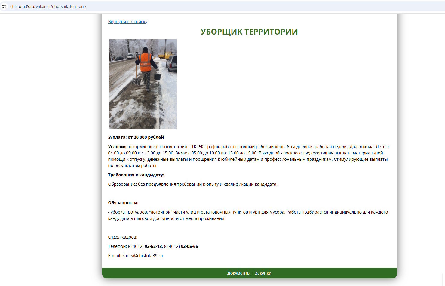 Корреспондент «Клопс» проверил это заявление. На сайте предприятия объявление о наборе сотрудников для точечной уборки размещено в разделе «Новости». При этом не указано самое важное — размер вознаграждения. На популярном сервисе по поиску работы нашлись вакансии от предприятия «Чистоты» только на полную занятость.