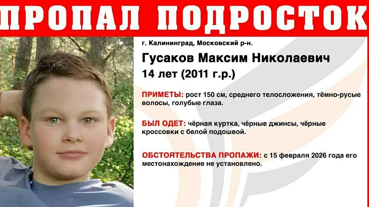 В Калининграде ищут 14-летнего Максима Гусакова, который пропал два дня назад. Об этом сообщает ПСО «Запад».
