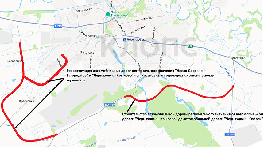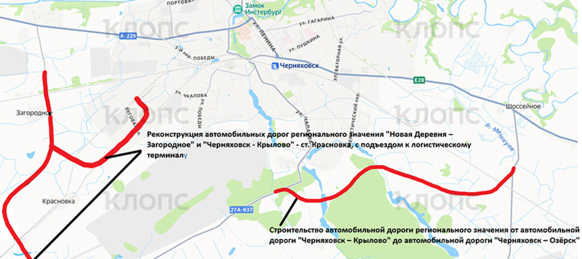 Дороги регионального значения пойдут в обход Черняховска и обеспечат подъезд к промышленной зоне и логистическому терминалу. Проект включает два этапа. Первый — реконструкция трасс Новая Деревня — Загородное и Черняховск — Крылово — ст. Красновка. Второй — строительство нового шоссе между дорогами Черняховск — Крылово и Черняховск — Озёрск.