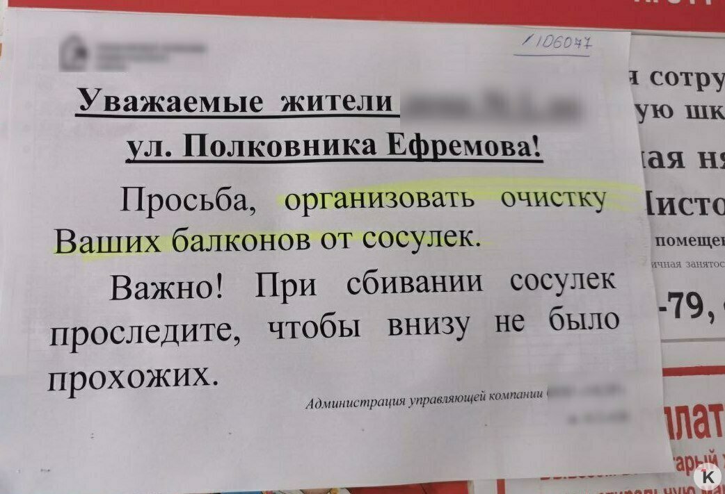 Взаимопонимания с УК не удалось добиться и здесь: пока сосульки естественным путём не растаяли, потоп не прекратился. Зато на подъездах появилось объявление, в котором коммунальщики просили людей заняться проблемой ледяных сталактитов самостоятельно. Но это оказалось не так просто: сосульки очень толстые, держались крепко. Так что «шваброй их не сбить, здесь нужен огнемёт», как выразилась одна из хозяек.