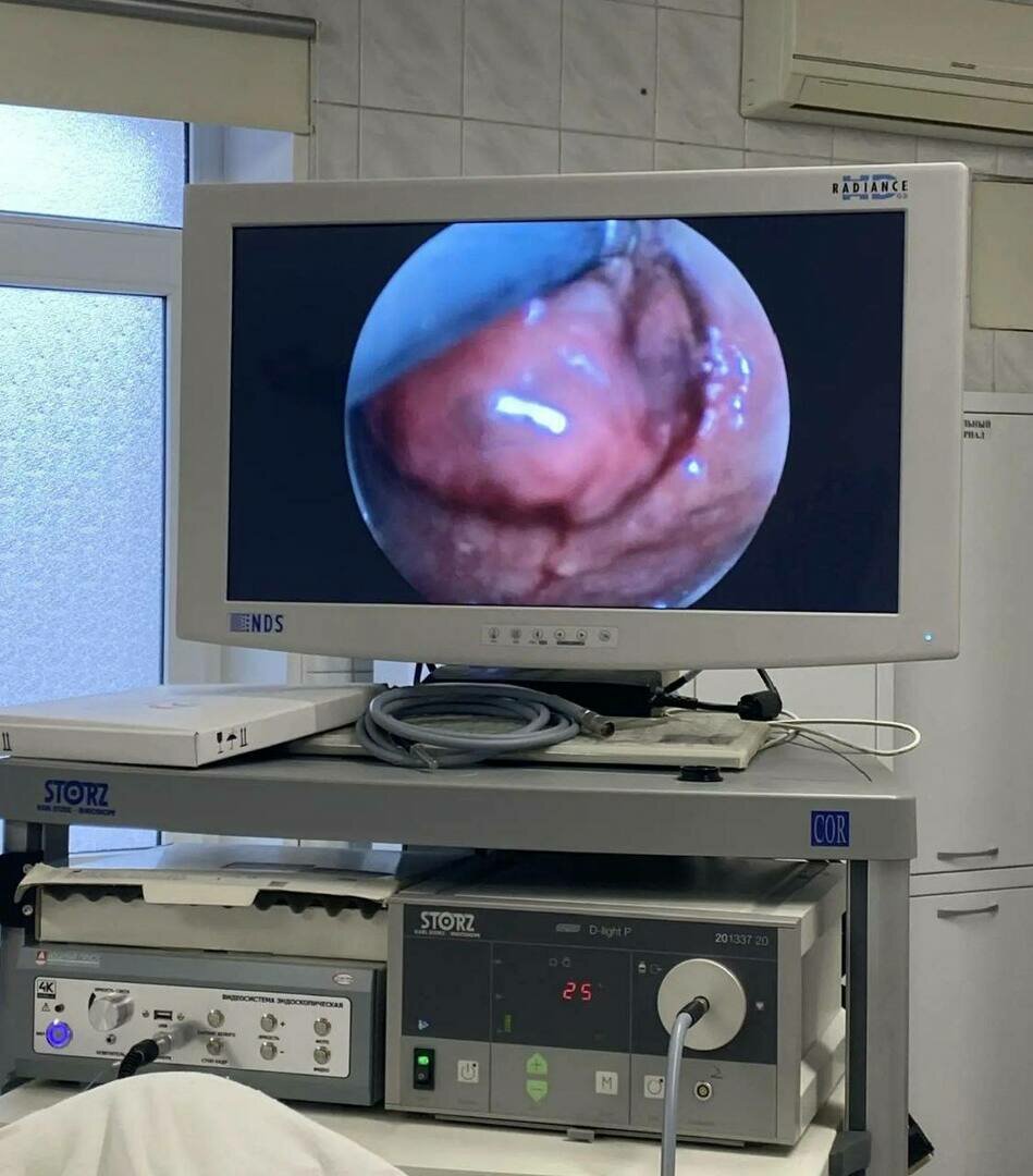 Пациенту 65 лет. Врачи использовали малоинвазивную методику: доступ к опухоли получили через естественные пути, поэтому на брюшной стенке не осталось швов. Хирург работал, ориентируясь на изображение с экрана — специальный прибор позволяет видеть операционное поле в увеличении и с подсветкой.