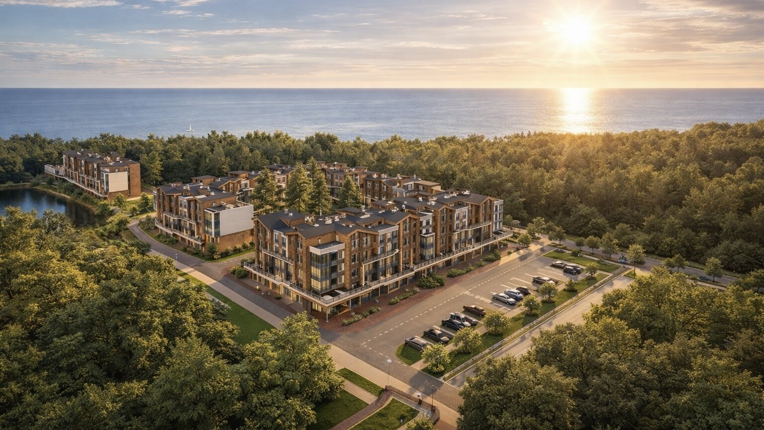 OTRADA Resort предлагает полноценную курортную среду: первую линию Балтики, спа-комплекс, бассейны, фитнес-пространства, ресторан, прогулочные зоны, собственное озеро, пентхаусы и террасы на крышах.