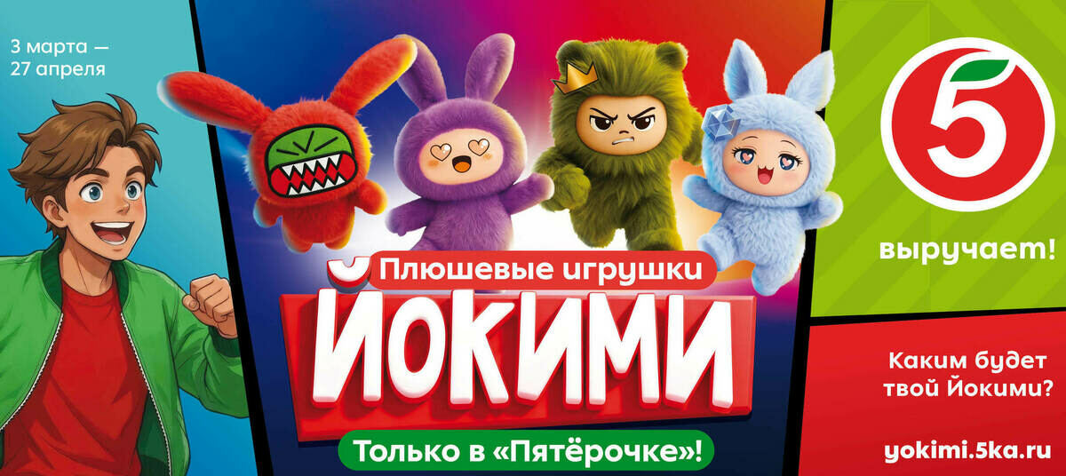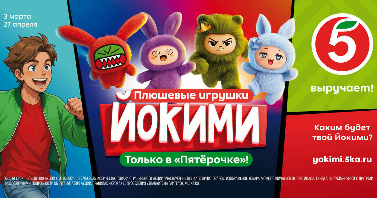 С 3 марта по 27 апреля 2026 года в торговой сети «Пятёрочка» проходит новая масштабная акция «Йокими». Главными героями кампании стали 16 коллекционных плюшевых персонажей с уникальным дизайном, каждый из которых олицетворяет эмоцию или черту характера. Это талисманы доброты, упакованные в плюш: дерзкие, задумчивые, игривые, мечтательные. Они подарят не только хорошее настроение, но и приятные призы.