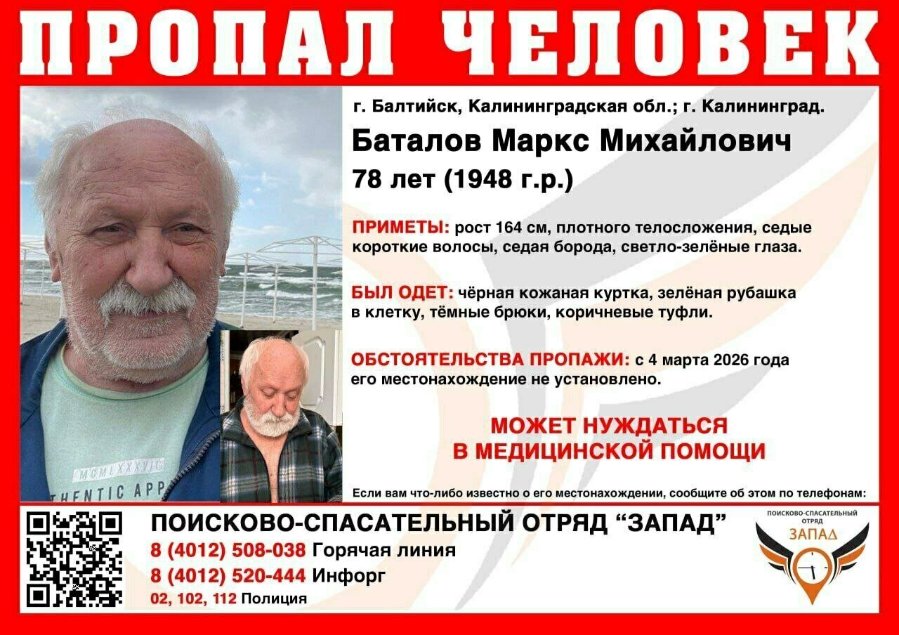 В Калининградской области ищут 78-летнего Маркса Баталова, который пропал сутки назад. Об этом сообщает ПСО «Запад» в четверг, 5 марта.