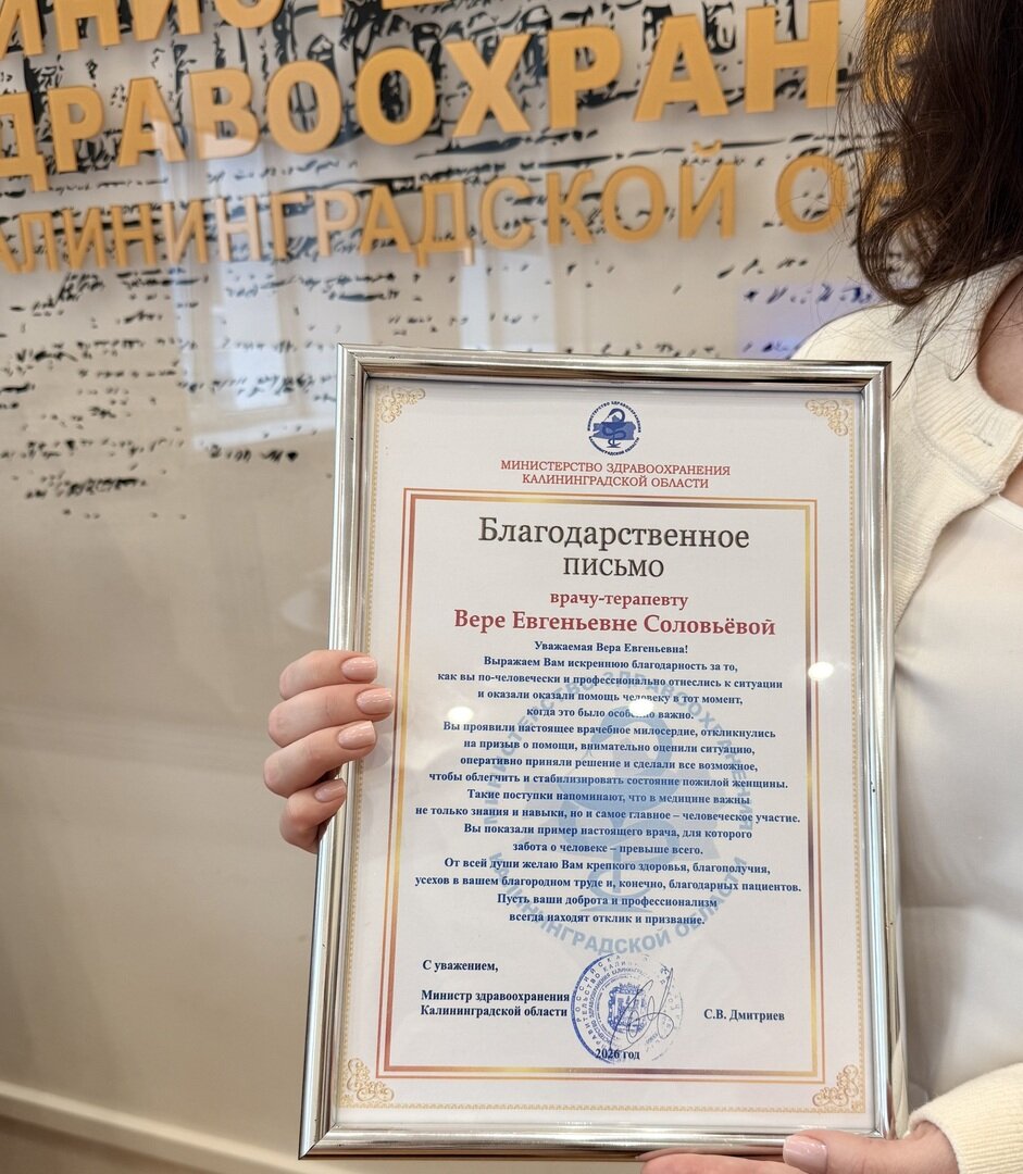 Калининградскому терапевту Вере Соловьёвой, которая в конце января пришла на помощь пожилой пассажирке автобуса, министр здравоохранения Сергей Дмитриев вручил благодарственное письмо. Об этом «Клопс» сообщили в пресс-службе ведомства в пятницу, 6 марта.