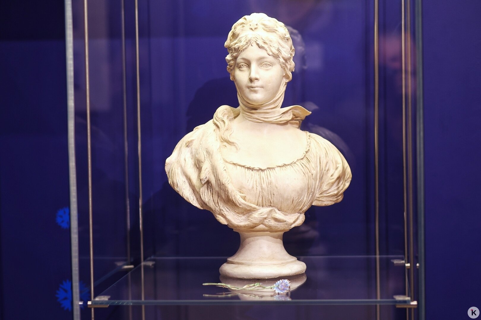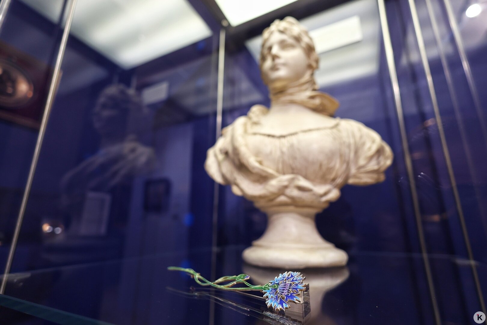 Гостей выставки встречали васильки — любимые цветы королевы. В синих тонах оформили и всё пространство: чтобы подчеркнуть эпоху и личные пристрастия Луизы. Посетительницам дарили бутоньерки, созданные руками сотрудников музея.