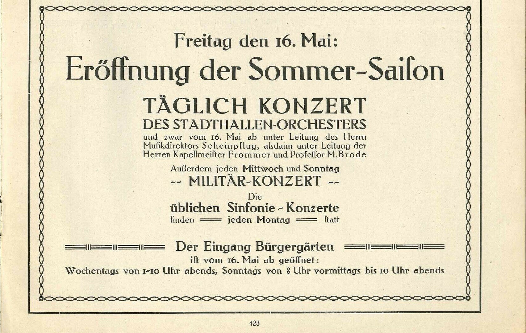 С чего это вдруг музыку играть в зоосаде? Здесь с самого открытия была предусмотрена вся инфраструктура: большой фестивальный, малый концертный, зал званых собраний и даже парочка павильонов для оркестра. Расписание больше походило на заполнение ежедневника: до 13 — matinee**, после 16 по средам и воскресеньям — программы в двух отделениях, в понедельник — только симфонии. В программах, вместе с Малером, пересекались Брамс и Лист, Штраус, Гайдн и Вебер. Удивительно, но за «спиной» у парка происходило примерно то же самое. Хуфен первым в Кёнигсберге получил единообразные названия улиц, которые любого бы соблазнили на создание плейлиста.