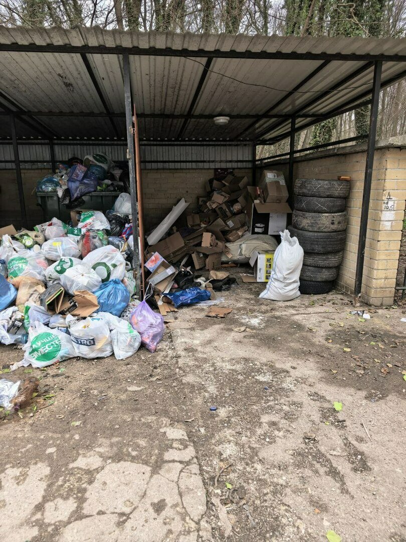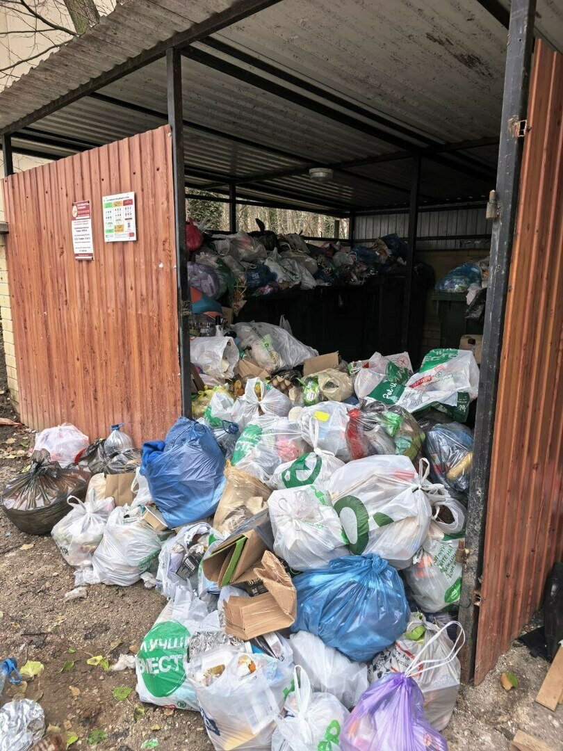 Во дворе ЖК мусорные контейнеры стоят под навесом. До них не добраться — путь преграждают кучи мусорных пакетов.