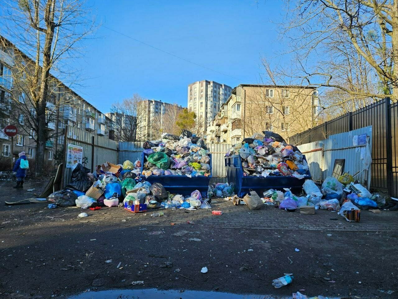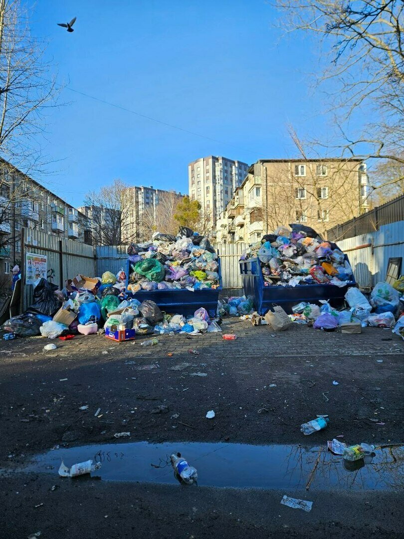Здесь летают тучи использованной упаковки — контейнеры хоть и опорожняют, но площадку вокруг убирают плохо. Всё, что не попало на борт мусоровозов, греется под лучами весеннего солнца и трепещет на ветру. Целлофановые и бумажные пакеты, коробки из-под еды, пластиковые бутылки ветер не первый день носит по району.