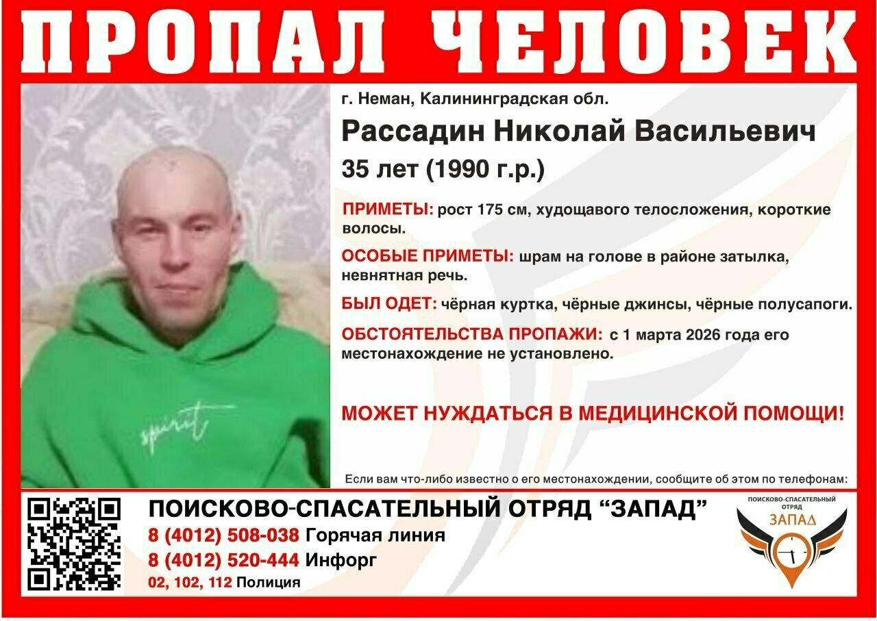 Мужчина — житель Немана. Он не выходит на связь с 1 марта. Его местонахождение неизвестно. Мужчина может нуждаться в медицинской помощи.