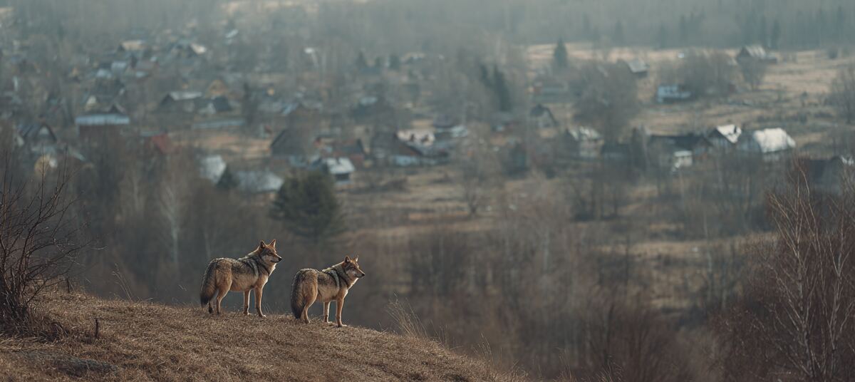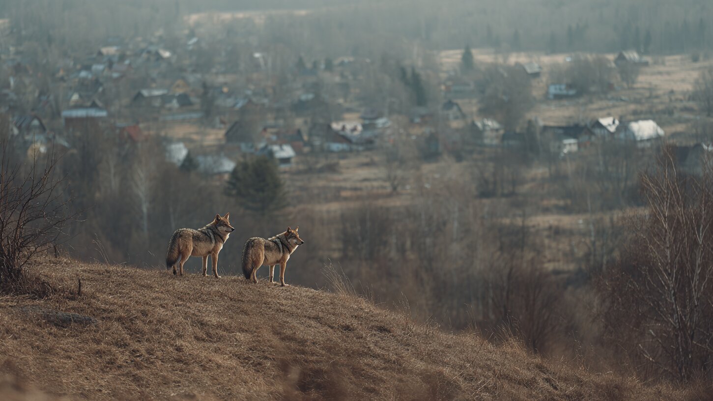 Двух волков видел в коттеджном посёлке «Сосны».
