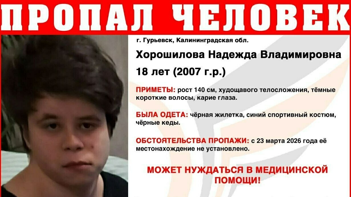 В Гурьевске ищут 18-летнюю Надежду Хорошилову, которая пропала четыре дня назад. Об этом сообщает ПСО «Запад».