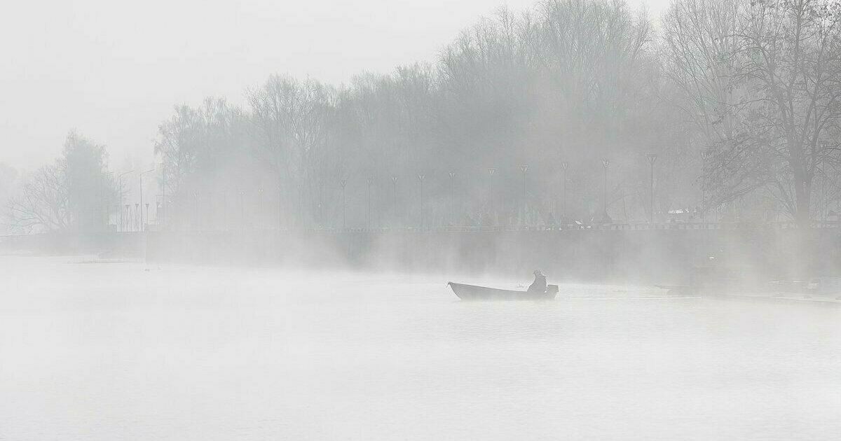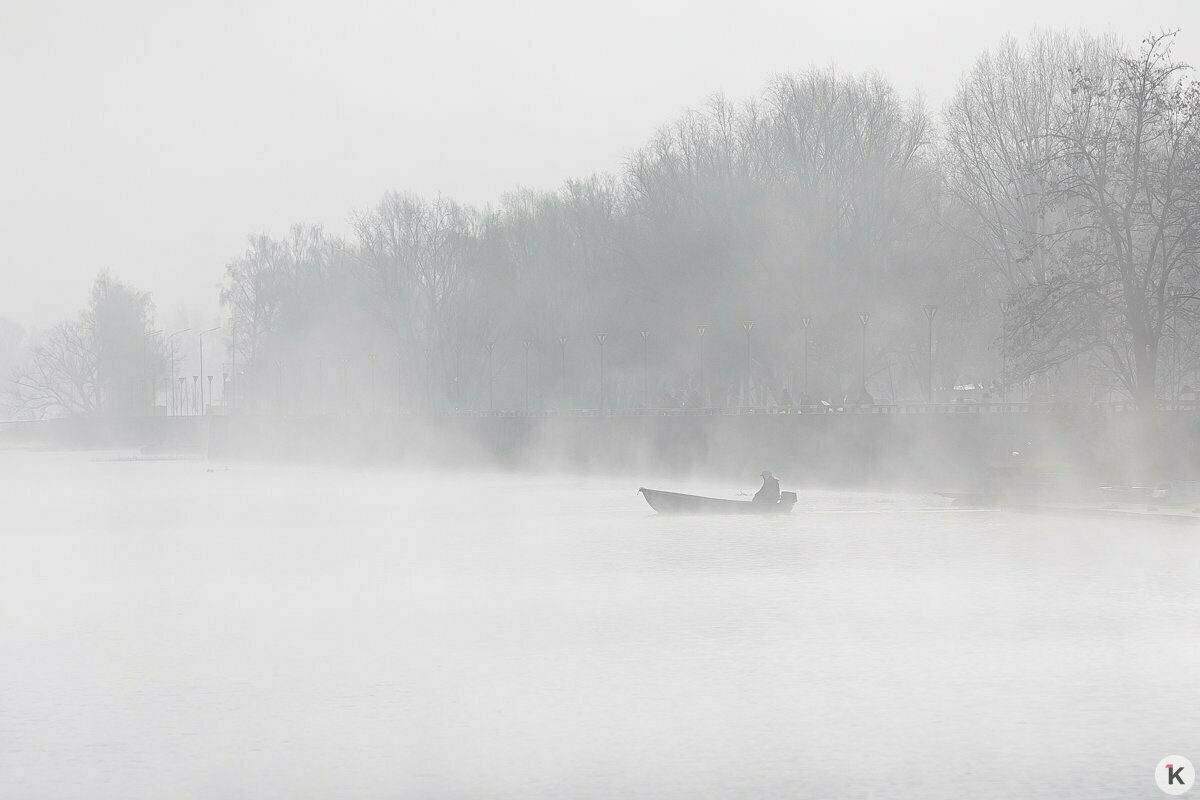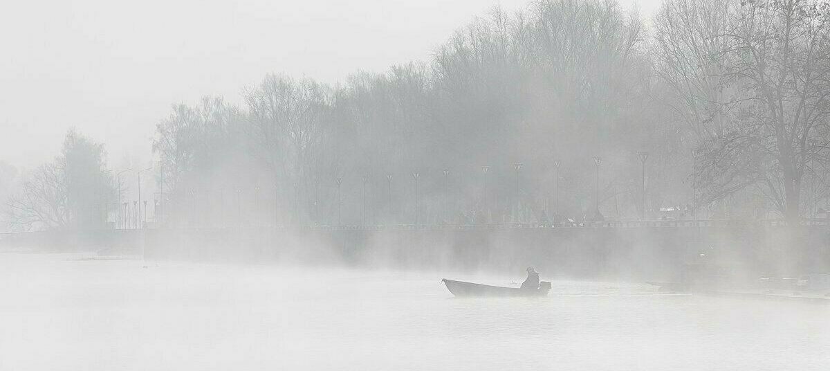 Фото дня: лодка пробирается сквозь густой туман на Преголе в Калининграде