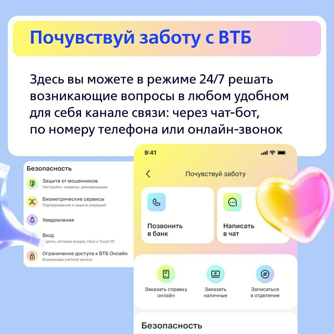 - «Почувствуй заботу» — здесь клиент сможет быстро и в режиме 24/7 решать возникающие вопросы в любом удобном для себя канале связи: через чат-бот, по номеру телефона или онлайн-звонок.