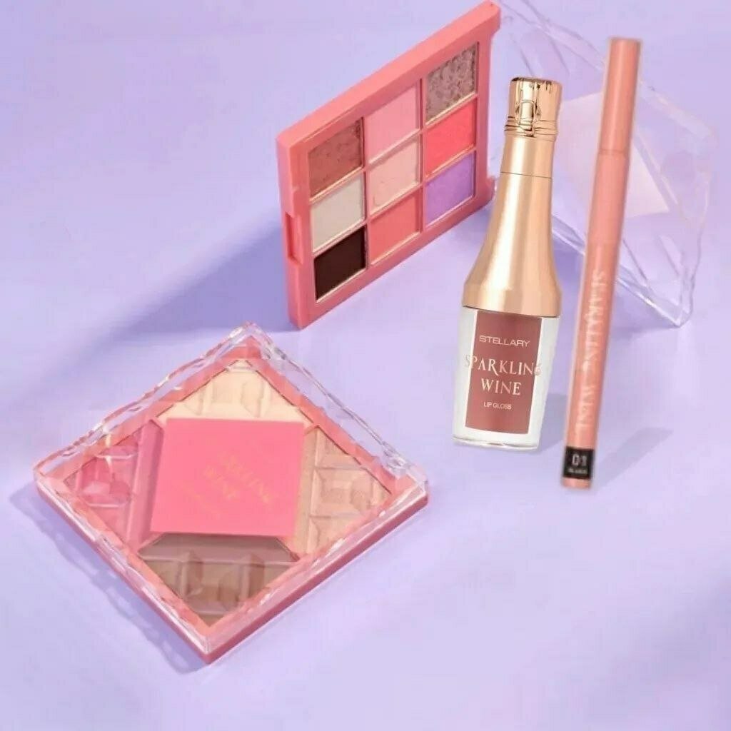 1. набор из лимитированной коллекции Sparkling wine collection от Stellary (блеск для губ, палетка для контуринга, палетка теней для век, подводка для глаз);