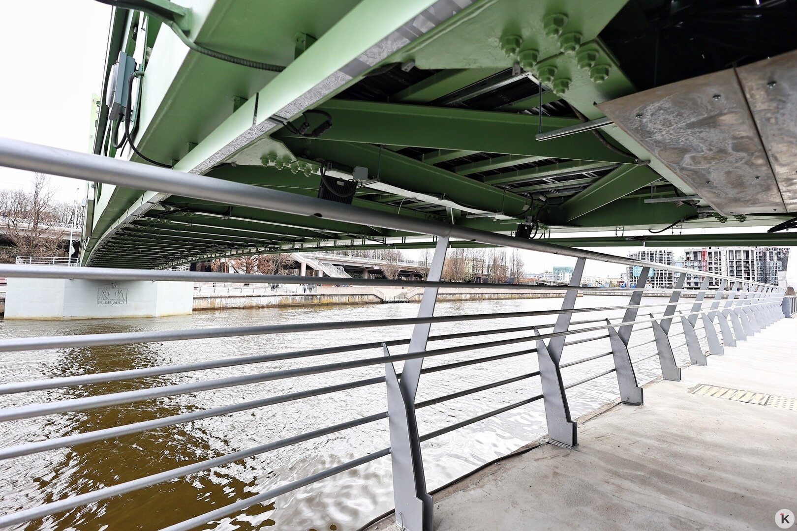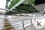 Мост получился лаконичным и функциональным. Здесь предусмотрели удобные спуски и качественное освещение. Мост будет разводным: периодически его будут поднимать для прохода судов.