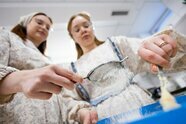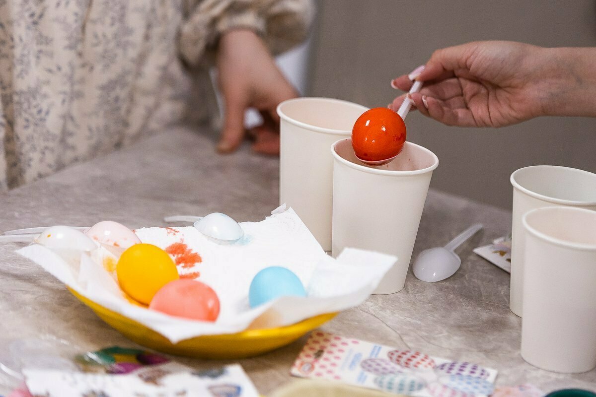 Пока в духовке поднимаются и румянятся куличи, можно заняться яйцами. Мастерицы опускают их в мисочки с красками, а потом украшают в технике декупажа. Помогает в этом настоятель храма, протоиерей Роман Промзелёв.