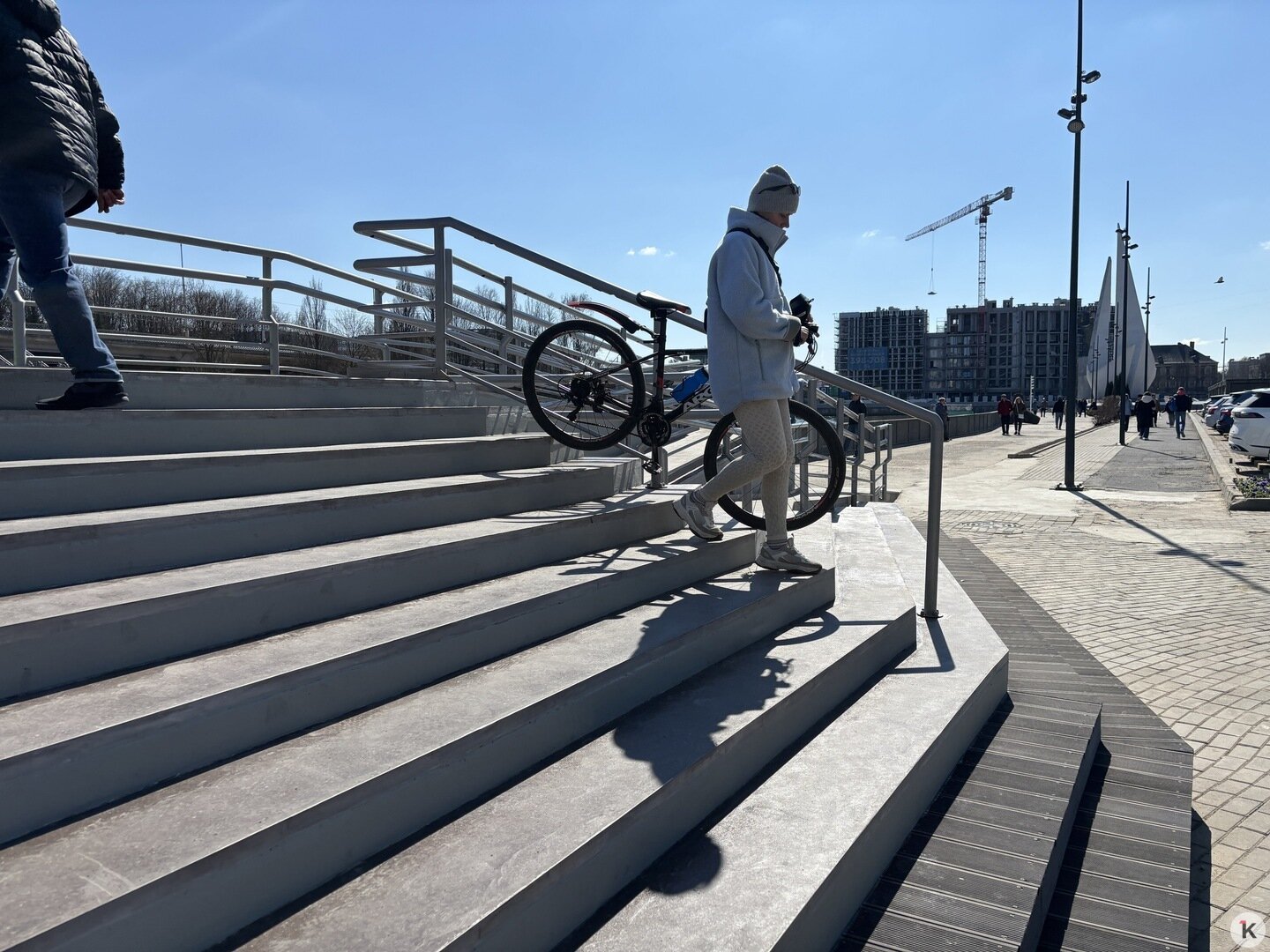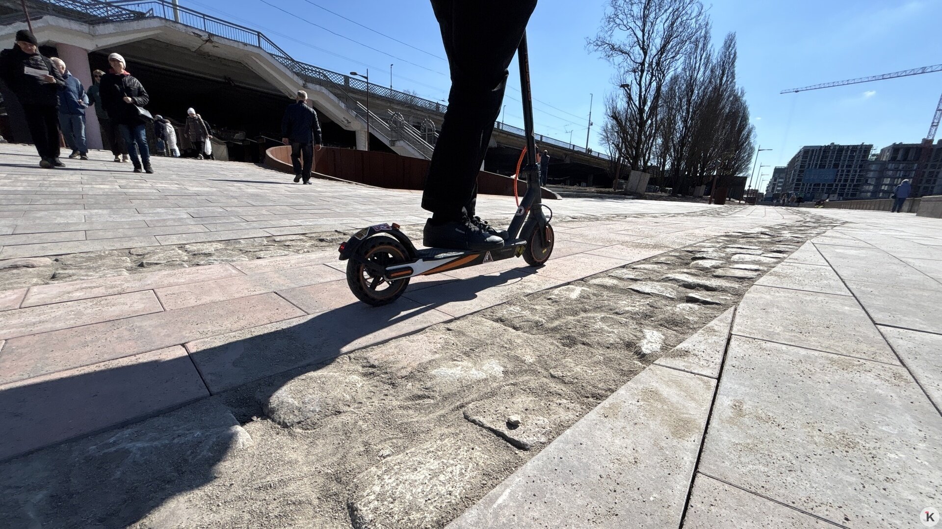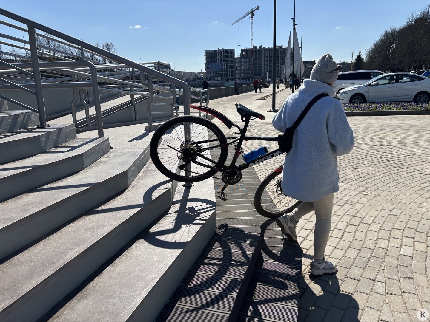 Неподалёку, на набережной, обустроили велодорожку. Её отделили от пешеходной зоны брусчаткой, однако решение оказалось спорным. Чтобы свернуть, нужно остановиться и перетащить велосипед. Для самокатов такой маршрут почти непроходим.