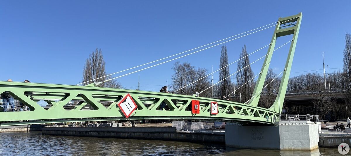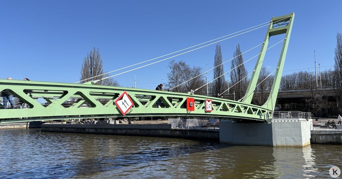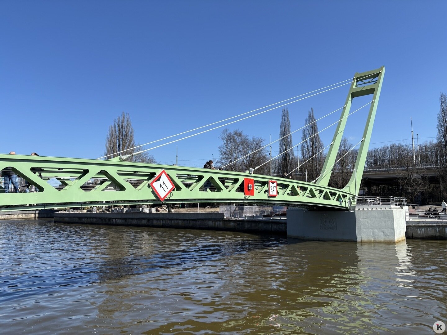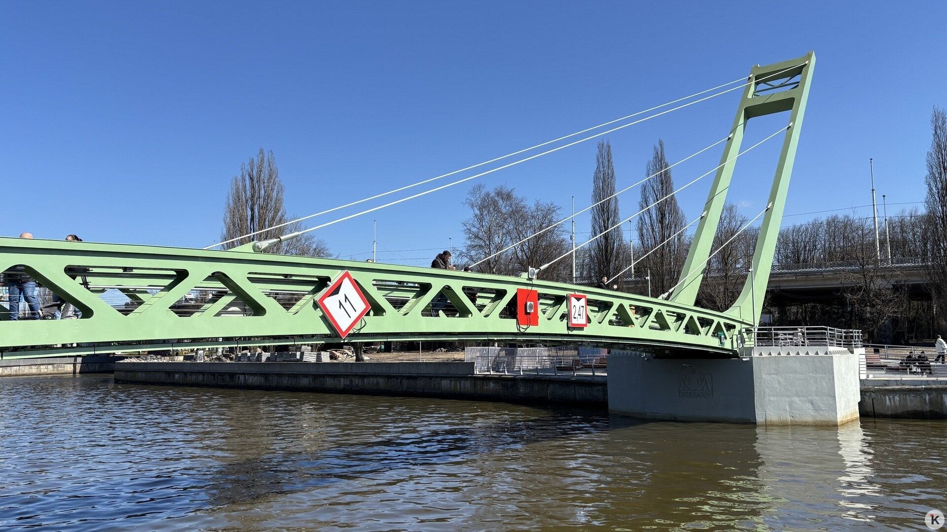 На мосту установлены знаки для проходящих под ним судов, один уже заметно перекошен. Разрешённые для судоходства габариты в обычном положении — 2,47 на 29 метров, в разведённом — 11 на 20. Кораблики с туристами на борту проходят свободно.