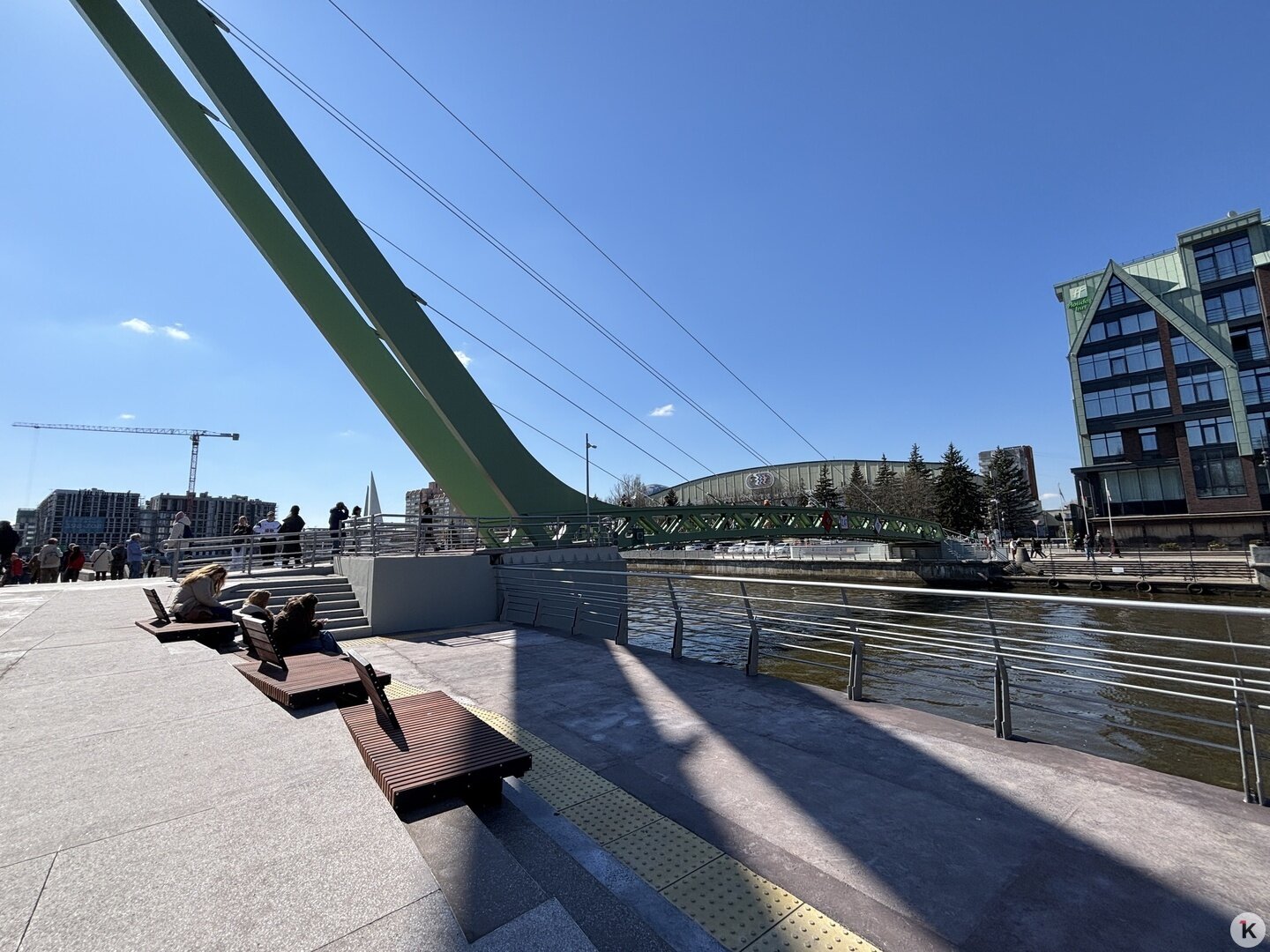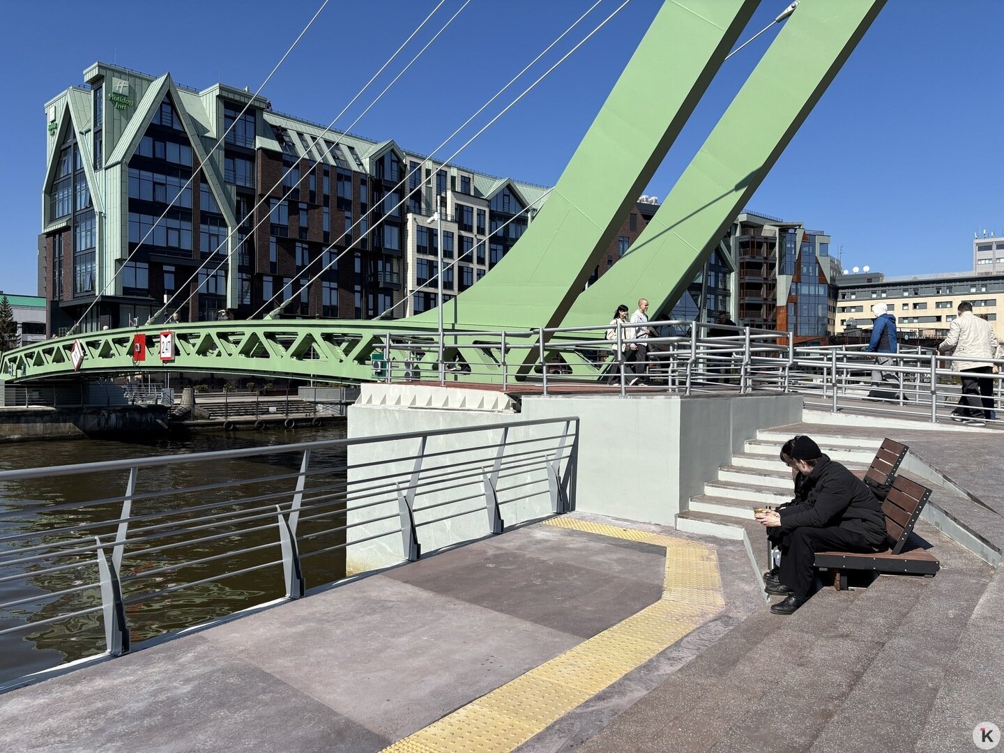 Работы вокруг моста пока продолжаются. На стороне острова Канта местами не уложена плитка, встречаются недоделанные стыки. Не хватает и скамеек — свободные быстро занимают.