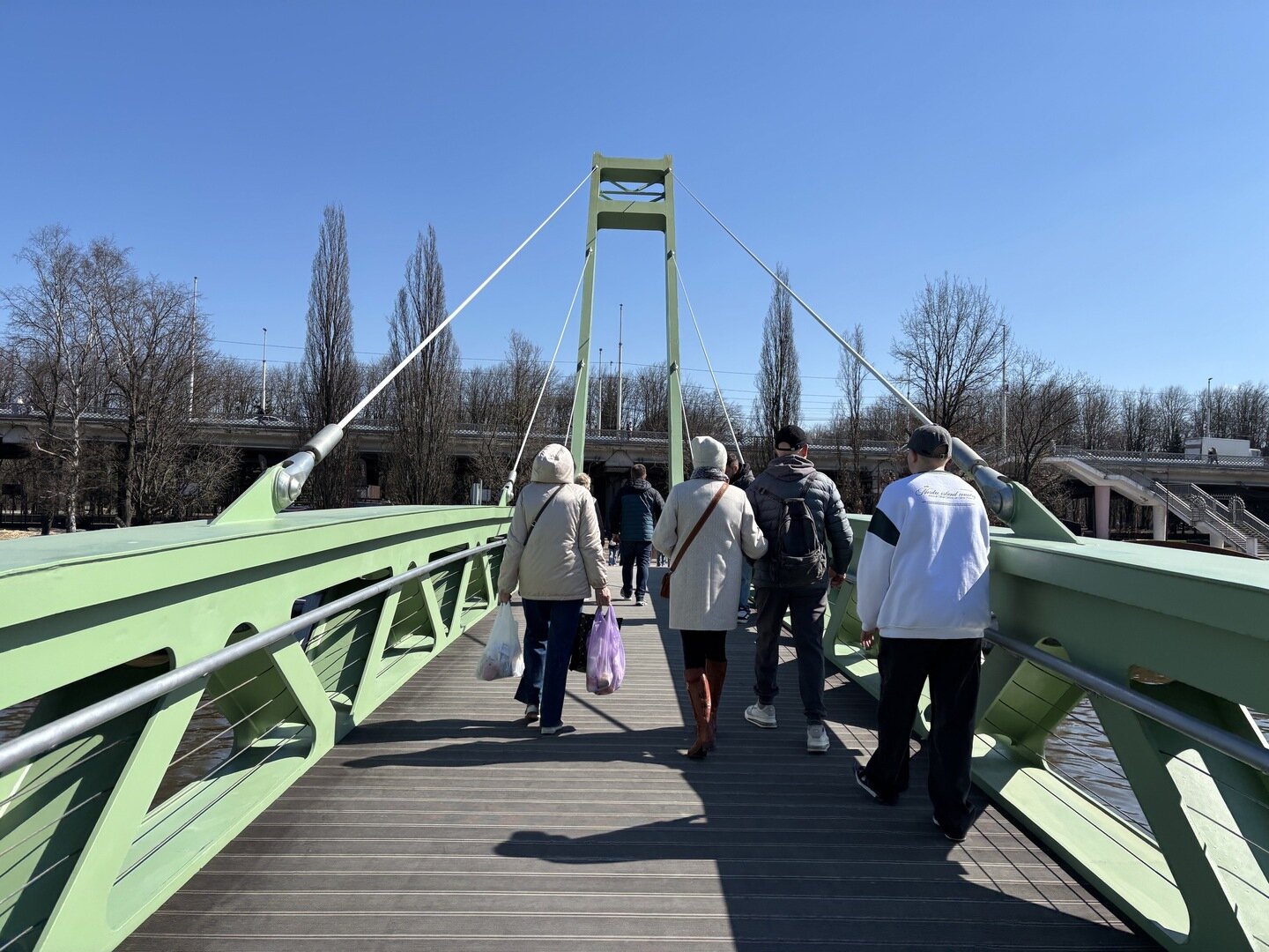 Днём в пятницу, 10 апреля, на мосту плотный поток людей. Многие останавливаются, чтобы сделать фото с видами на реку и Кафедральный собор, кто-то гуляет с коляской, кто-то просто рассматривает новую локацию. Экскурсоводы уже включили мост в маршруты — группы останавливаются прямо на переправе. Кто-то любуется Философским с эстакады.