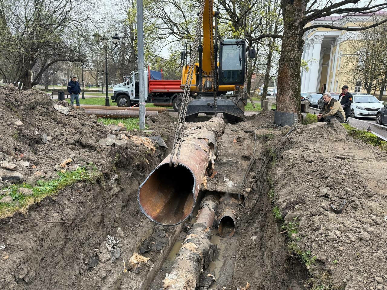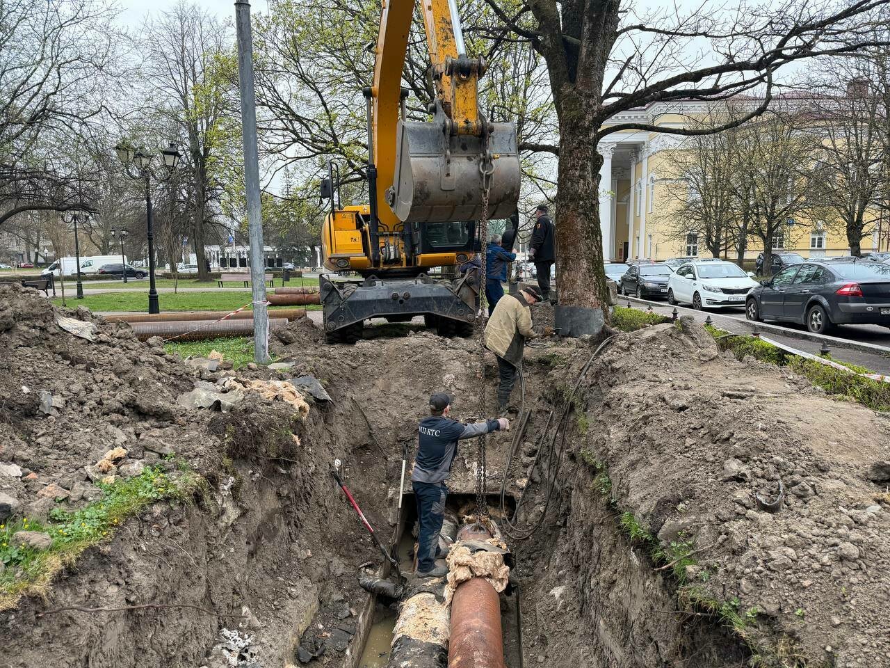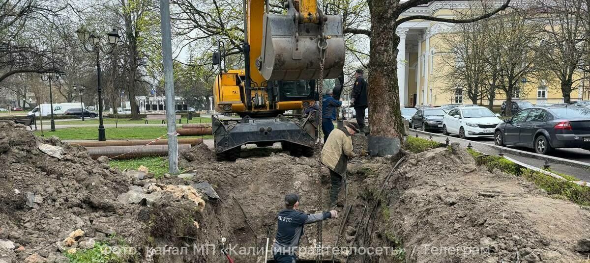 На улице Грекова в сквере возле драмтеатра во время ремонта тепломагистрали разрыли часть газона и вскрыли участок у дороги. Об этом МП «Калининградтеплосеть» пишет в своём телеграм-канале в среду, 15 апреля.