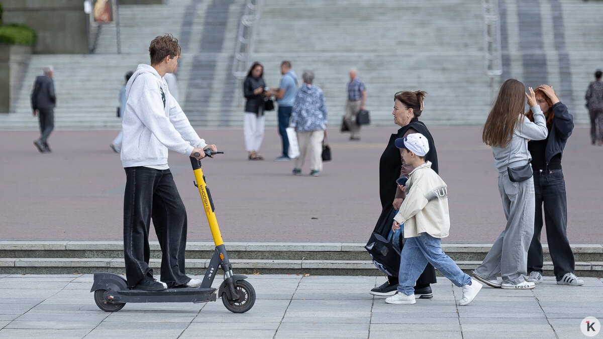 - Район Пролетарской и Черняховского у ТЦ «Европа» — плотный пешеходный поток на узких тротуарах. Самокатчик здесь вынужден буквально протискиваться, рискуя задеть людей или оказаться под автобусом при повороте.