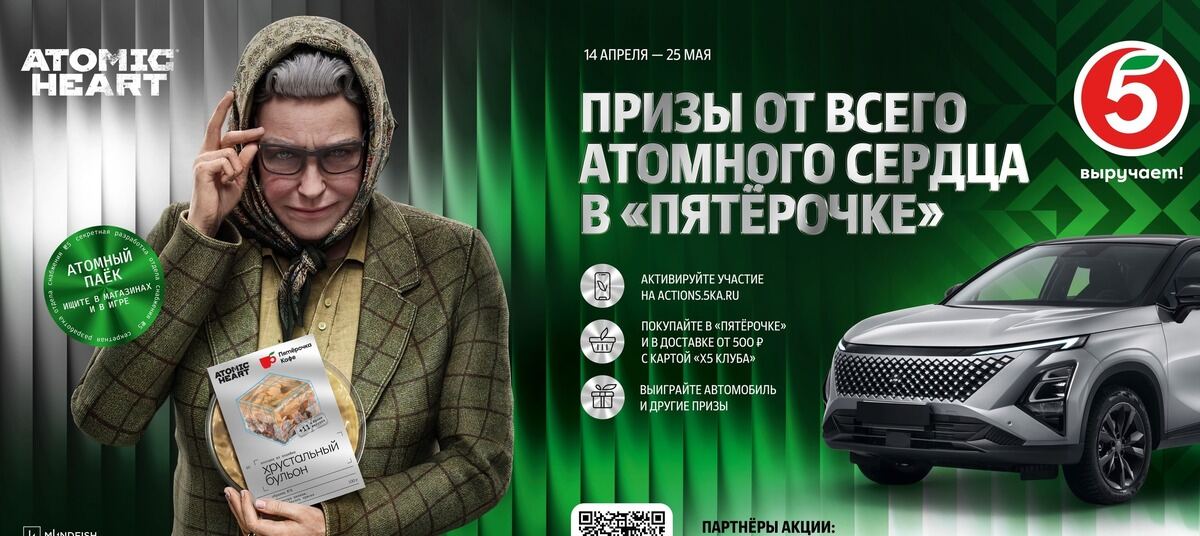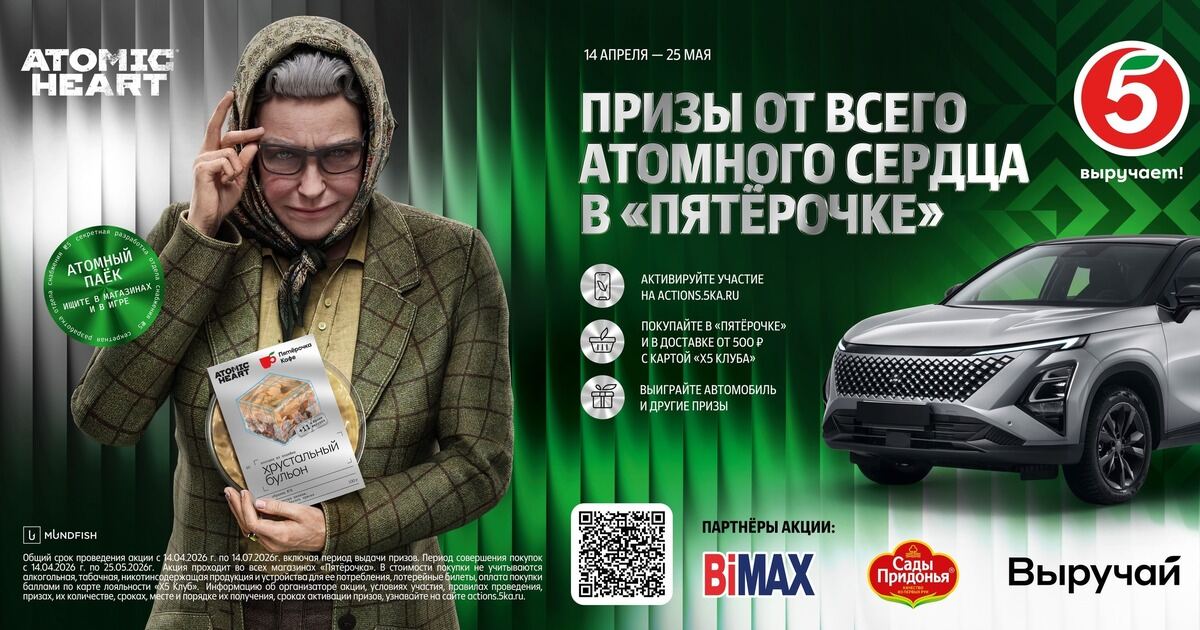 Торговая сеть «Пятёрочка» объявила о запуске федеральной акции «Призы от всего Атомного сердца в “Пятёрочке”». Коллаборация с популярной видеоигрой Atomic Heart (18+) приурочена к выходу нового дополнения (DLC 4).