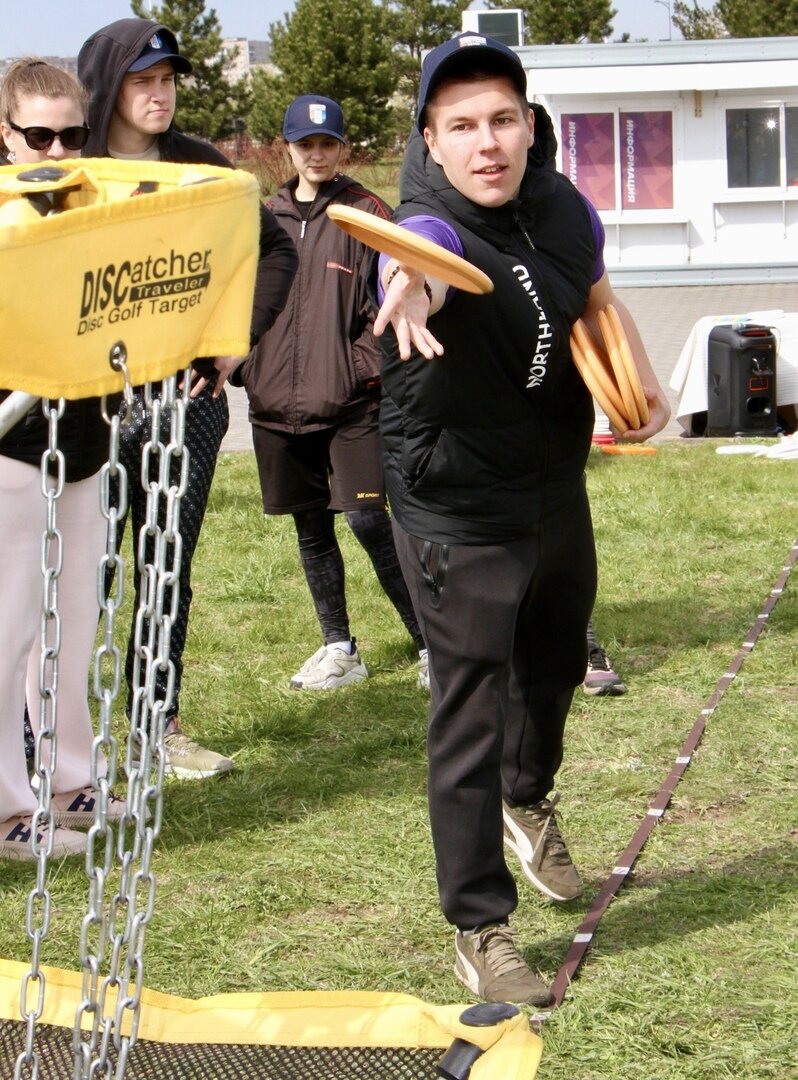 Рядом уже готовились команды «УниверЛиги» — студенческого патт-турнира по диск-гольфу. Участники представляли разные учебные заведения региона. Несмотря на соревновательный формат, обстановка оставалась максимально дружелюбной: игроки поддерживали друг друга, подсказывали и нередко аплодировали даже соперникам за точные попадания диском в корзину с дальнего расстояния.