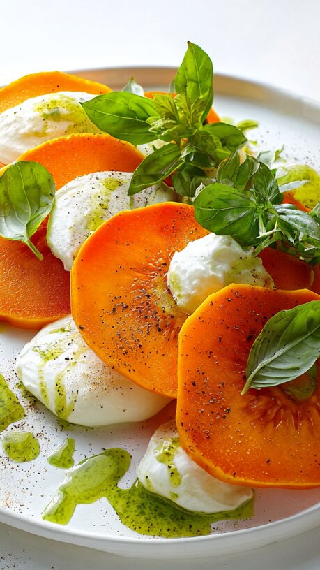 Хурму нужно вымыть и нарезать тонкими пластинками, затем красиво разложить на тарелке. Сверху разместить страчателлу и полить бальзамическим соусом. Рукколу и базилик промыть, обсушить и добавить к сыру. В завершение — немного оливкового масла и горсть кедровых орешков. Закуска готова.