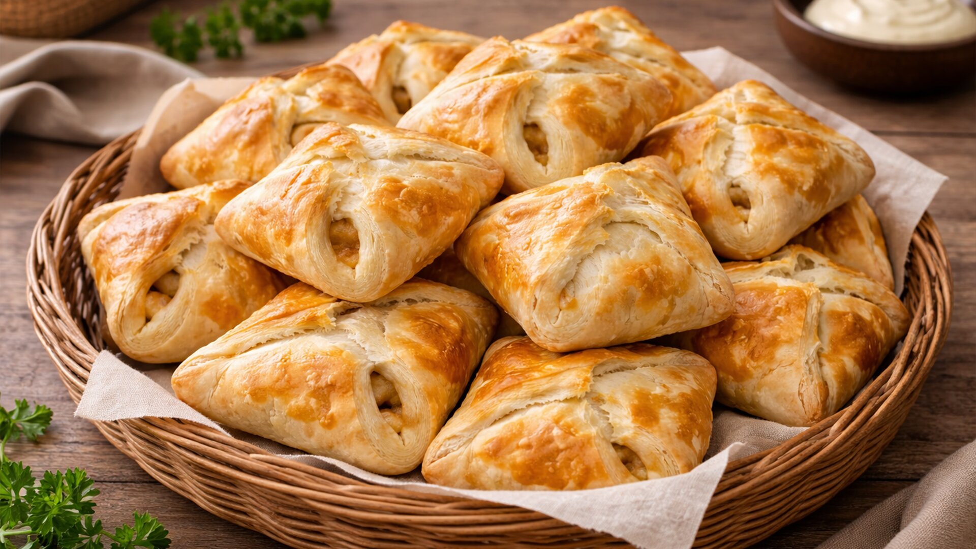 Слоёное тесто размотать и разрезать на десять равных частей. Каждый кусочек слегка раскатать. В центр уложить начинку, собрать края в форме конверта, скрепляя уголки в середине. Можно слегка смочить их водой — так пирожки не раскроются при выпечке.
