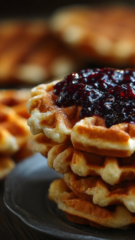 Постепенно ввести муку, тщательно размешивая тесто, чтобы не осталось комков. Готовую массу выкладывать ложкой в разогретую вафельницу и выпекать до золотистой корочки. Свежеиспечённые вафли остаются мягкими даже после полного остывания.