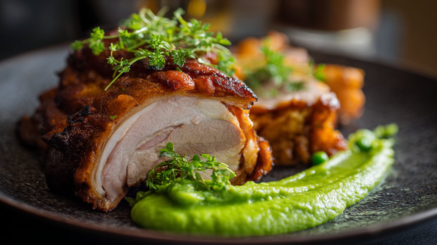 Для соуса часть бульона смешать со сливками и сметаной, уварить, добавить горчицу, муку и 100 граммов сливочного масла, прогреть до загустения. Горошек взбить блендером с оставшимся маслом, приправить и прогреть. Подавать рульку ломтиками с соусом и горячим гороховым пюре.