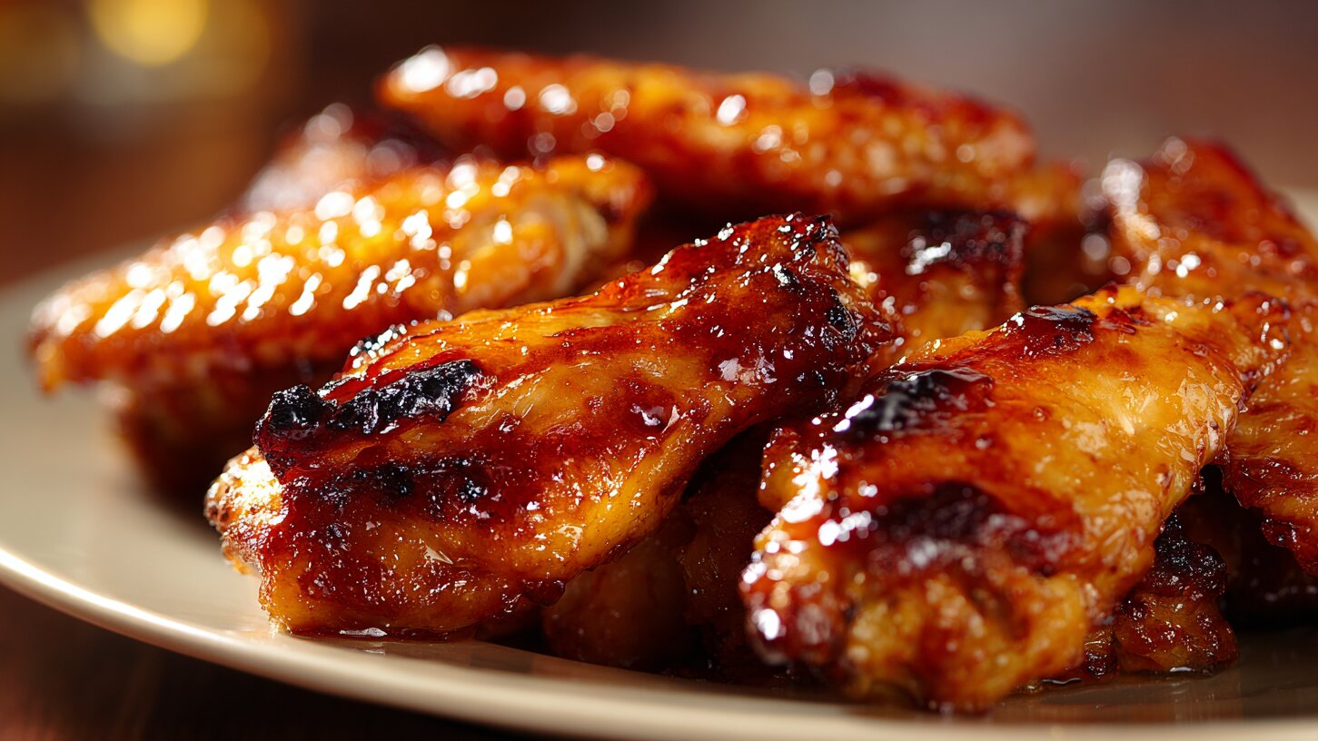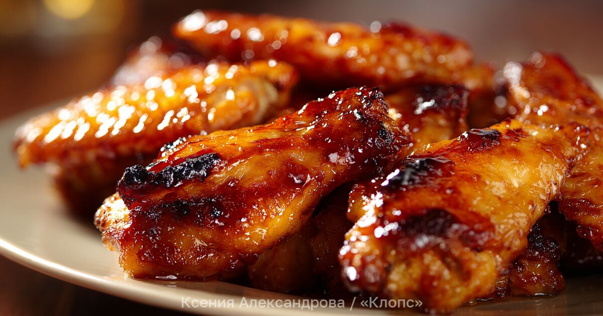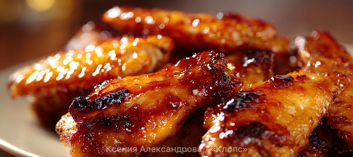 Для глазури смешать кетчуп, мёд, соевый соус, измельчённый через пресс чеснок, имбирь и коньяк. Обильно смазать крылышки и поставить в разогретую до 180 °С духовку на 25–30 минут. Готовое блюдо подавать в горячем виде. При желании можно сбрызнуть крылышки соком лайма.