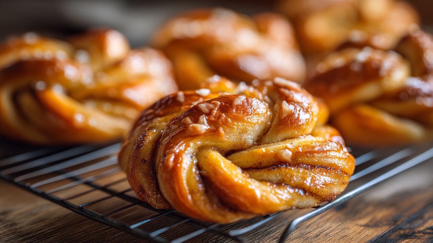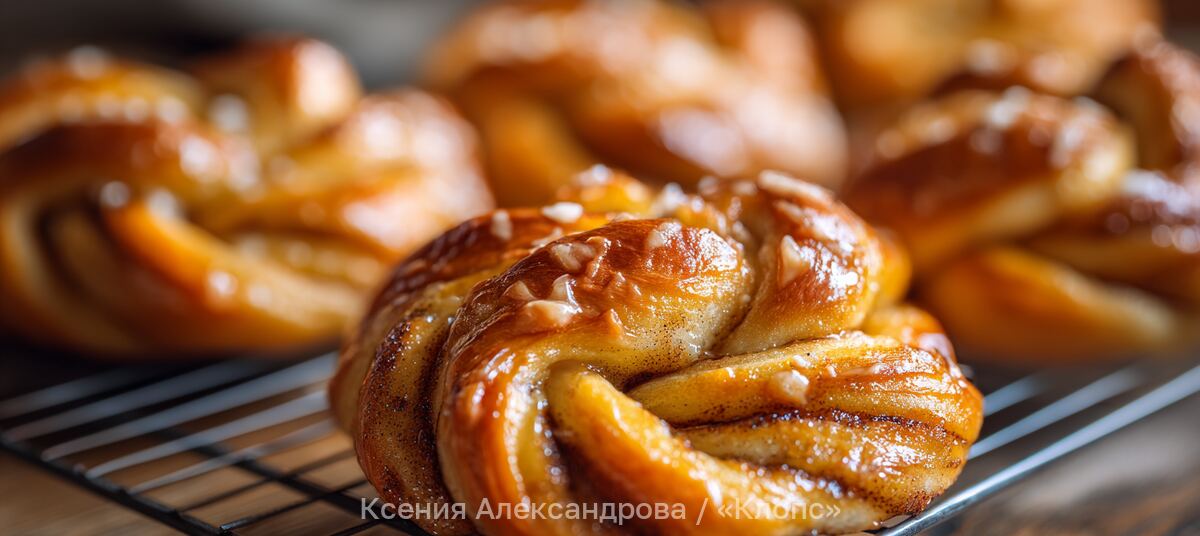 Оставшееся холодное масло перетереть с корицей, кардамоном и столовой ложкой сахара. Когда тесто поднимется, его нужно раскатать в большой пласт толщиной 0,5–0,8 см. Половину площади намазать начинкой и закрыть свободным краем. Затем раскатать тесто до изначальной толщины и нарезать на широкие полоски. Каждую нужно свернуть в спираль и закрутить в улитку, чтобы получился узелок.