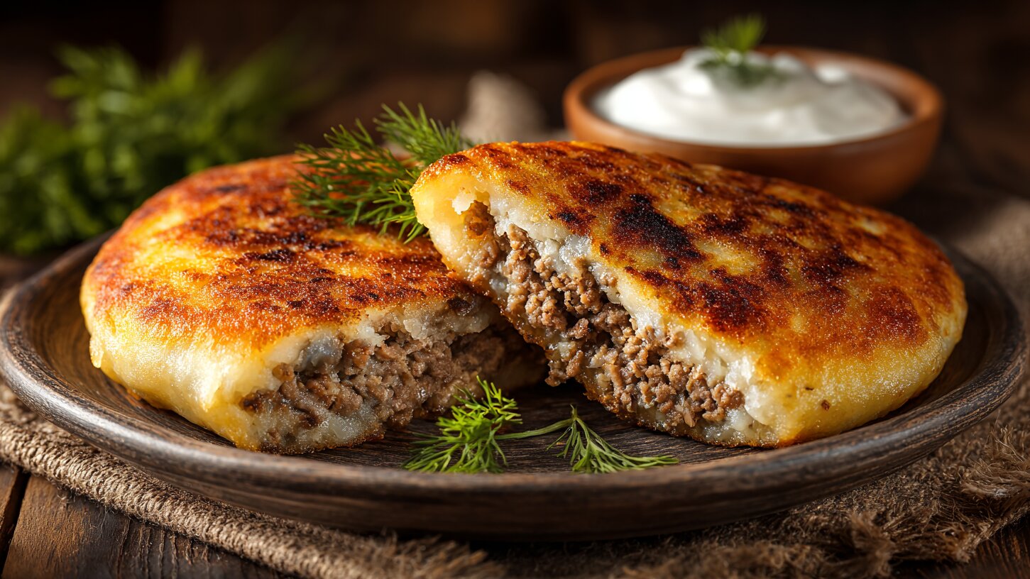 Взять в руку немного картофельного теста и формировать лепёшку. Положить слой фарша и накрыть вторым слоем теста. Должны получиться плоские медальоны с начинкой внутри. Обжарить по 6–8 минут с каждой стороны до золотистой корочки. Готовое блюдо подавать со сметаной и зеленью.