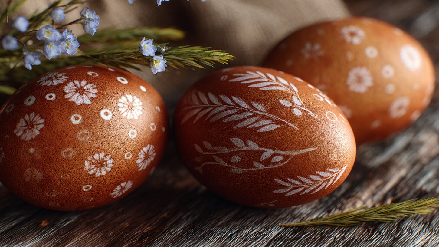 В преддверии Пасхи в магазинах быстро пропадают белые яйца, так как их проще всего красить. Однако многие зря недооценивают коричневую скорлупу, которая тоже может послужить фоном для уютной росписи в винтажном стиле. Для крафтового дизайна нужны воск, немного красителя и воображение.
