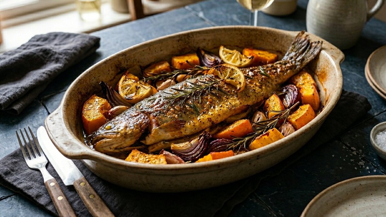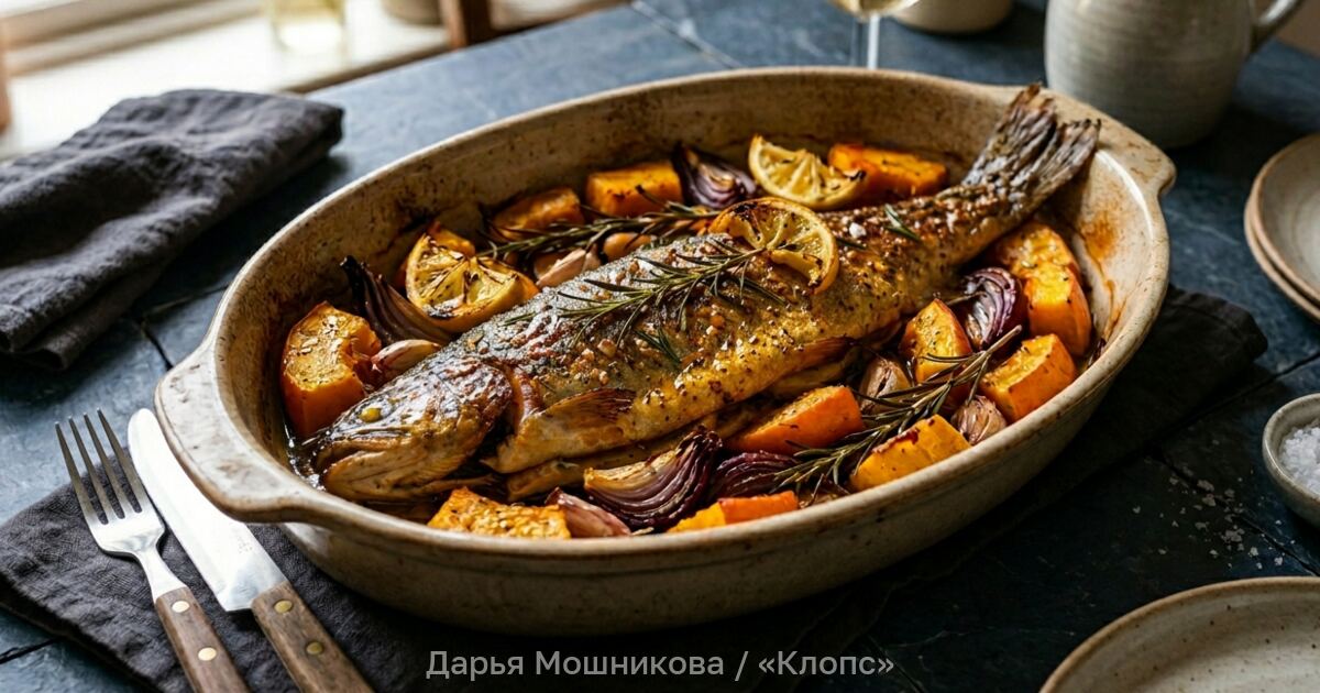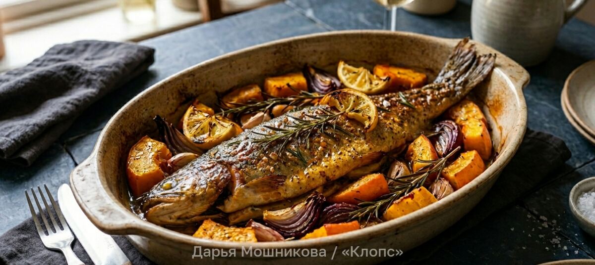 Запечённая рыба с тыквой и розмарином — это идеальный баланс нежности и вкуса. В процессе приготовления овощь обретает кремовую текстуру и пропитывается соком форели, а та перенимает аромат пряных трав. Однако это не всё — последним штрихом в идеальном обеде станет пикантный медово-горчичный соус. Как приготовить произведение кулинарного исскуства на домашней кухне, узнал «Клопс».
