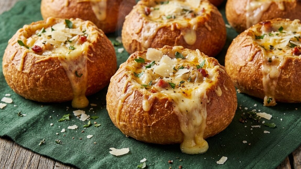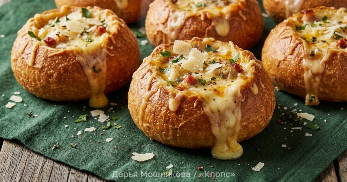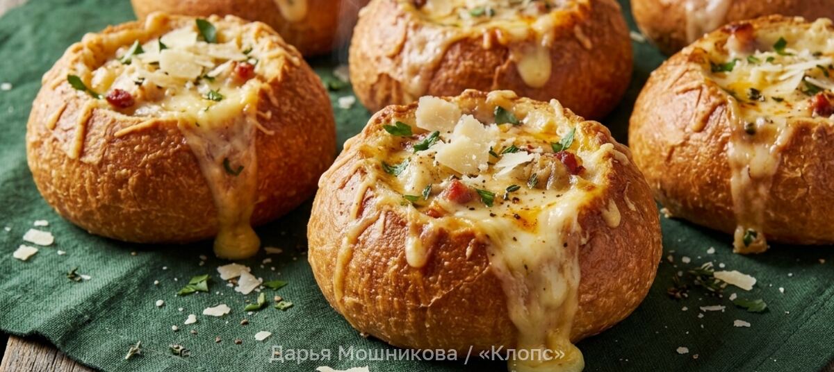 Смазать поверхность растопленным сливочным маслом, выложить на застеленный пергаментом противень и выпекать 20 минут при 190 °С. Когда булочки подрумянятся, достать их из духовки и срезать верхушки. Ещё горячий мякиш примять ложкой, чтобы внутри образовалось пустое пространство.