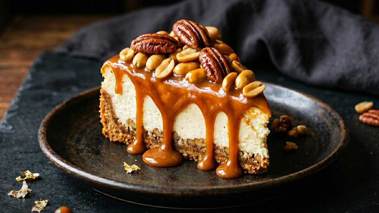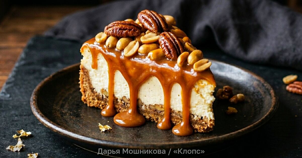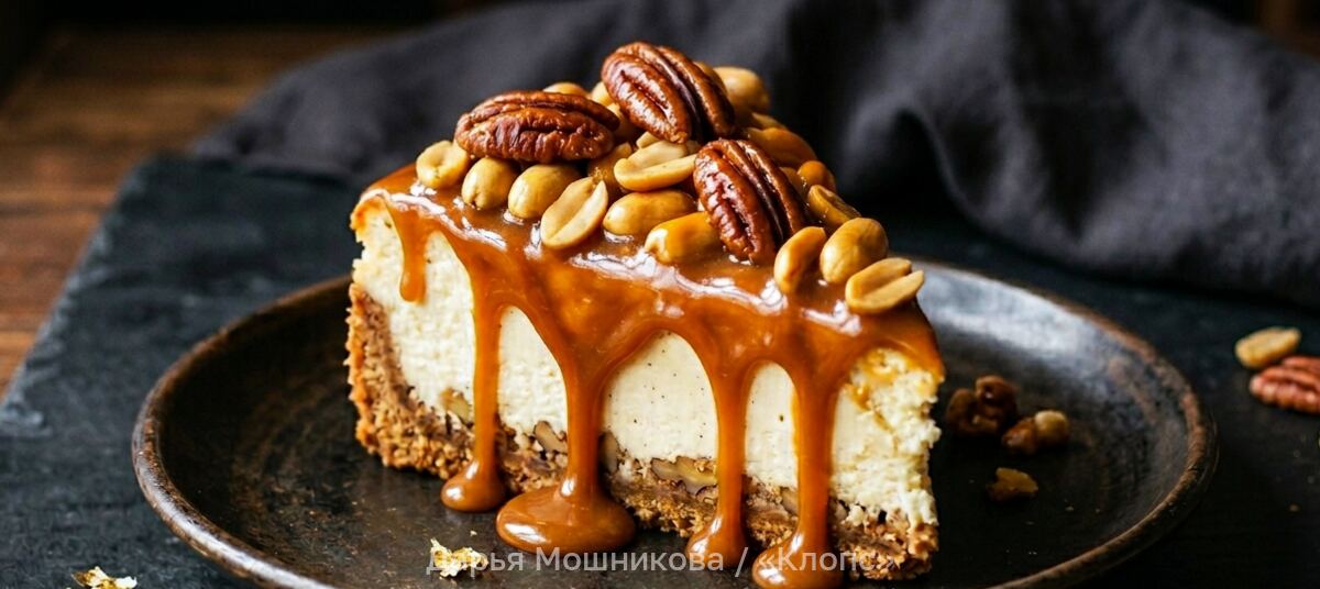 В сотейнике с толстым дном растопить сахар с 50 мл воды. Когда карамель станет янтарного цвета, выключить огонь и влить сливки. Всё аккуратно перемешать, добавить 30 гр сливочного масла, пекан и арахис. Выложить ореховую карамель поверх торта и убрать в холодильник ещё на 20 минут.