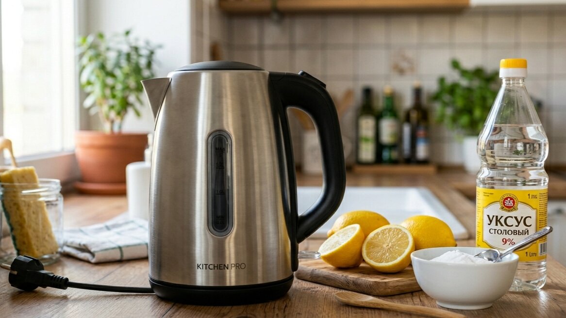 Смешать воду и уксус в пропорции 1:1 и залить чайник до максимальной отметки. Вскипятить и оставить на несколько часов. Слить раствор, помыть чайник, а затем пару раз вскипятить чистую воду, чтобы выветрить запах уксуса.