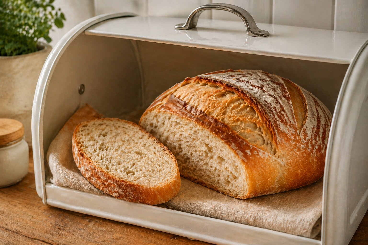 Для хранения выпечки идеально подойдёт хлебница с отверстиями, так как они помогают воздуху циркулировать и не дают влаге накапливаться. Чтобы усилить эффект, внутрь можно положить хлопковые или льняные мешочки, которые впитают лишнюю жидкость.