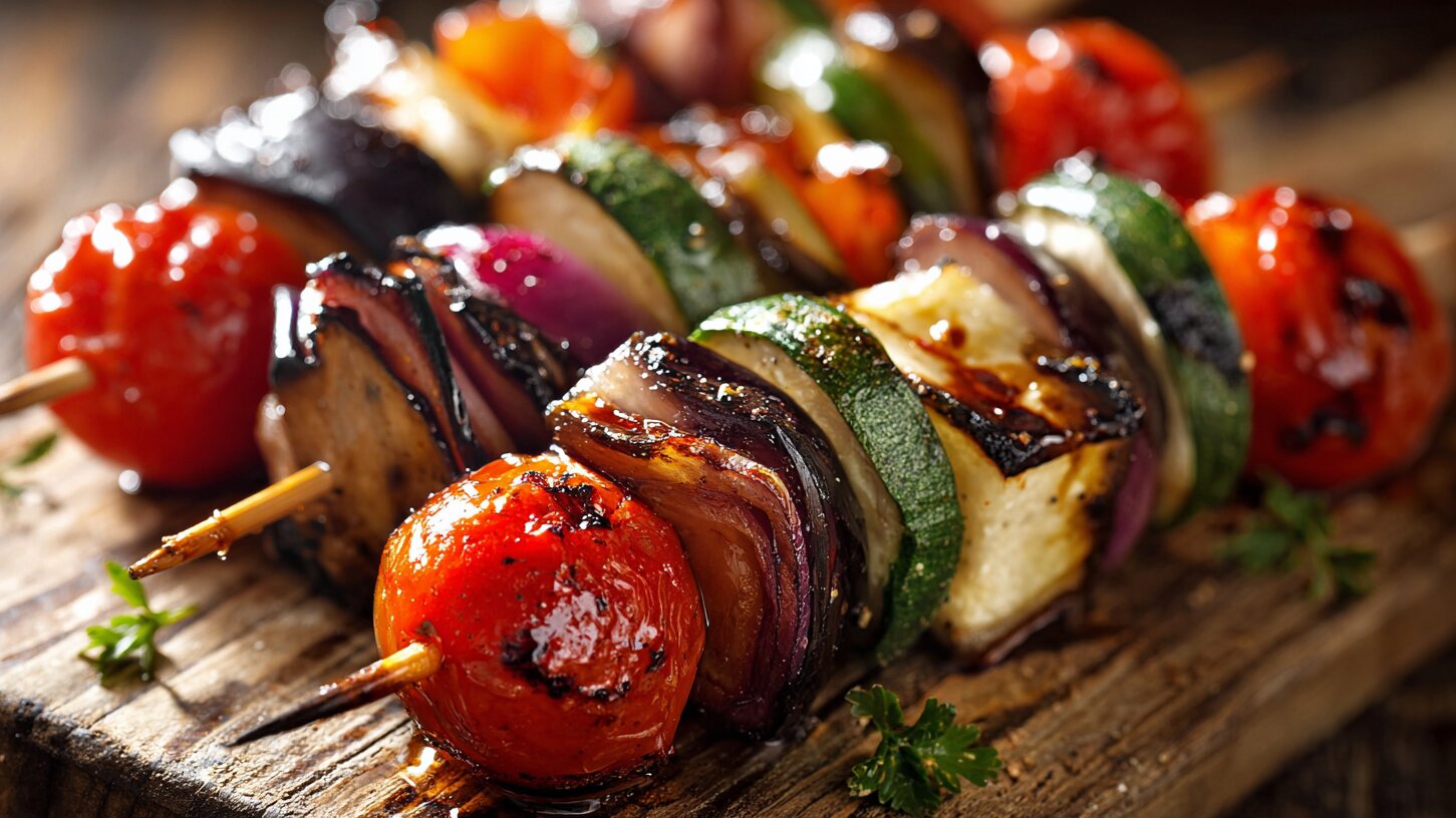 Жарить на расстоянии около 10 см от углей по 3–4 минуты с каждой стороны. Готовое блюдо можно подавать прямо на шампурах или переложить все овощи в миску, чтобы получился тёплый салат. Для заправки подойдут оливковое масло, йогурт с чесноком, соусом ткемали или остро-сладким.