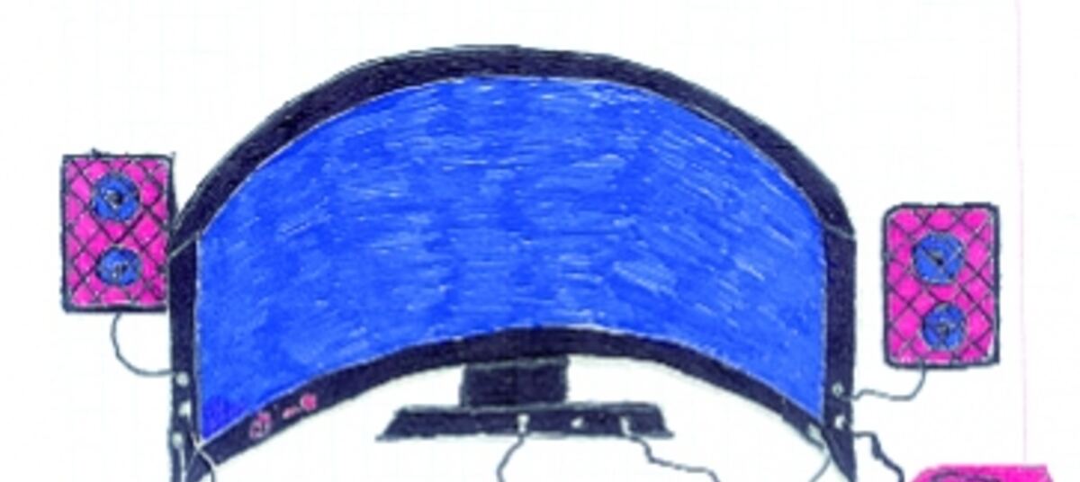 - Я обожаю играть в компьютерные игры, вот и придумал классную приставку, в которую вставлены DVD и CD-rom, Play Station. В комплект входит жидкокристаллический монитор (кстати, он имеет форму полукруга), колонки, джойстик и игровой руль!