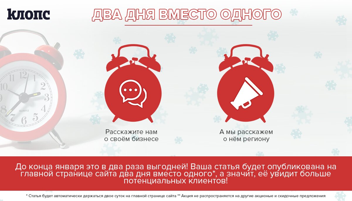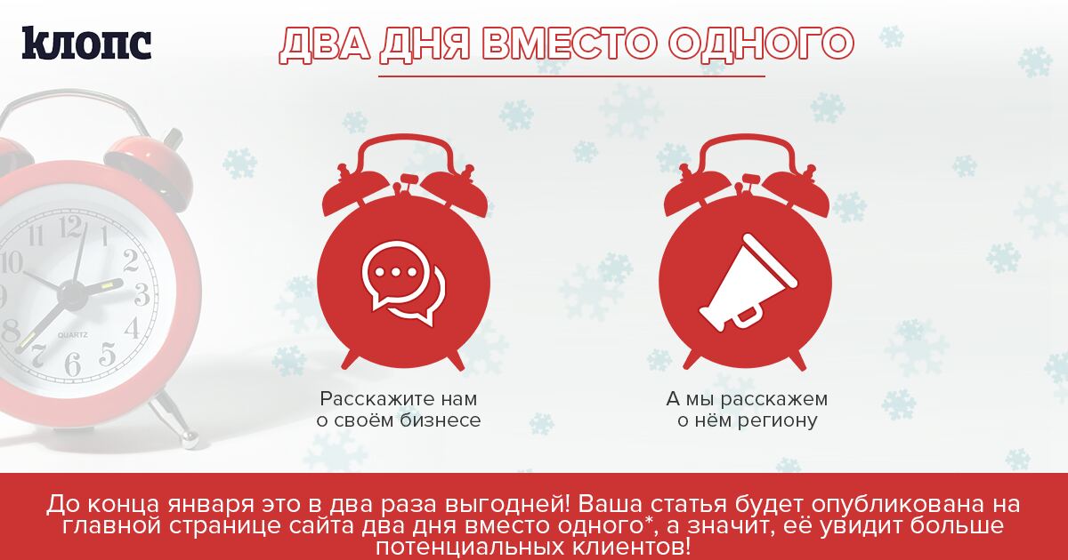 Расскажите нам о своём бизнесе, а мы расскажем о нём региону. До конца января это в два раза выгодней! Ваша статья будет опубликована на главной странице сайта два дня вместо одного*, а значит, её увидит больше потенциальных клиентов!