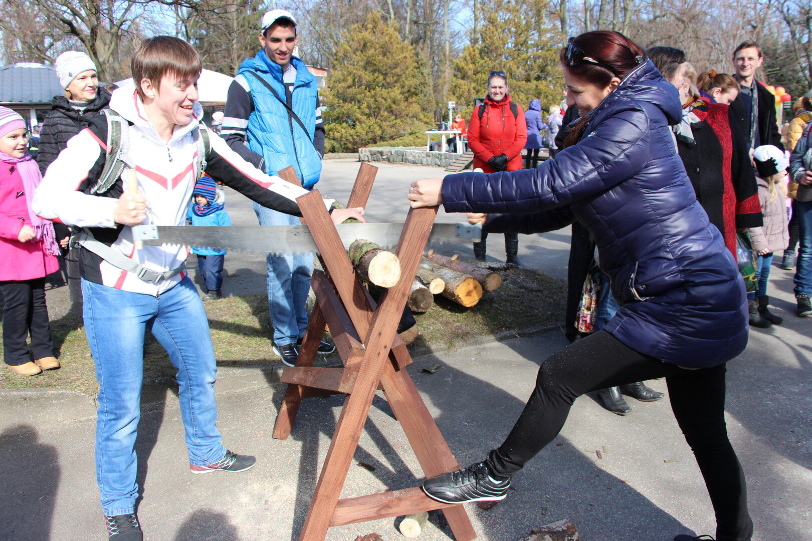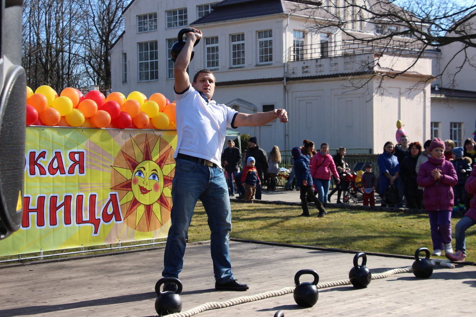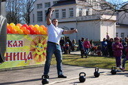 12:00–15:50 "Добры молодцы да красны девицы" (сцена у фонтана). С шутками-прибаутками пилим брёвна на скорость и ради удовольствия, поднимаем гири, перетягиваем канат. Создают праздничное настроение коллективы: