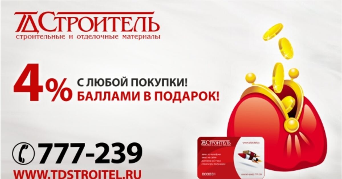 Наше преимущество перед конкурентами в том, что, во-первых, накопительная карта ТД "Строитель" — это возможность оплачивать до 100% стоимости своих покупок накопленными баллами, и, во-вторых, саму карту можно оформить не только в магазине лично, но и при заказе по телефону или на сайте! В последних двух случаях баллы будут начислены на весь размер покупки, а карта будет доставлена вместе с заказанными товарами. Просто и выгодно!