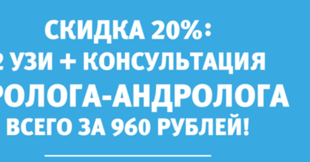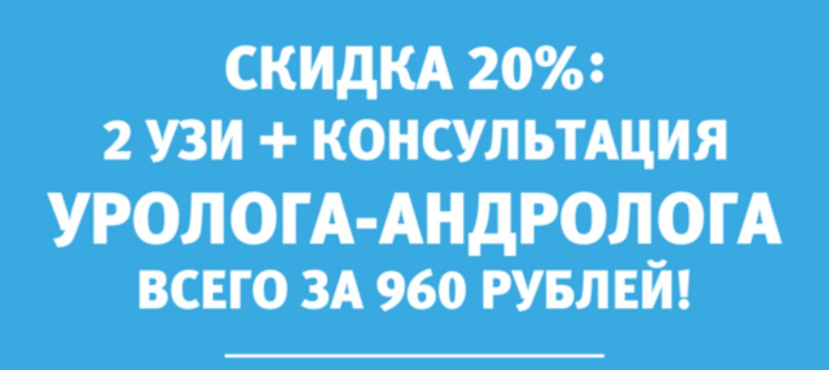С 1 по 28 февраля действует скидка 20% на приём и обследование у уролога-андролога. Ультразвуковое исследование предстательной железы, ультразвуковое исследование мочевого пузыря, приём и консультация уролога стоят всего 960 рублей. Повторные приёмы у врача – бесплатно!